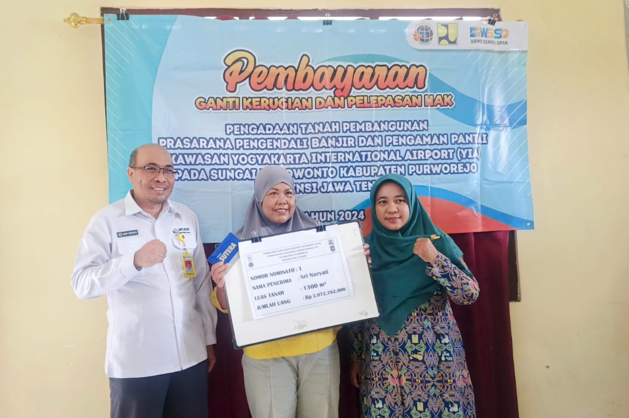 Jatengpress.com, Purworejo – Pelaksana Pengadaan Tanah (P2T) pada Proyek Pembangunan Prasarana Pengendali Banjir dan Pengaman Pantai Kawasan YIA pada Sungai Bogowonto Kabupaten Purworejo, Jawa Tengah, melaksanakan pembayaran Uang Ganti Rugi (UGR) dan pelepasan hak atas tanah warga terdampak.