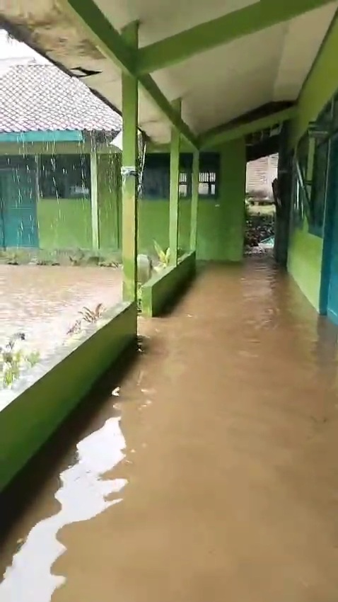 Dalam sebuah unggahan video yang beredar memperlihatkan kondisi yang sangat mengkhawatirkan. Air berwarna keruh kecoklatan mengalir deras tak terkendali, bahkan menuruni tangga dan halaman sekolah hingga ke dalam ruang kelas.