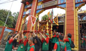 USUNG KIO : Para umat bersama tamu dan panitia mengusung Kio (tandu) berisi kimsin (rupang) Namo Cia Lan Phu Sa, saat keluar dari Kelenteng, akan dimulainya kirab, pada kirab HUT ke-21 Kelenteng Kwan Sing Bio dan HUT Kesempurnaan Namo Cia Lan Phu Sa, di TITD Kwan Sing Bio, Jalan Tanggul Mas Raya 9, Tanah Mas, Semarang Utara, Rabu (29/10/2025). Foto : Sucipto