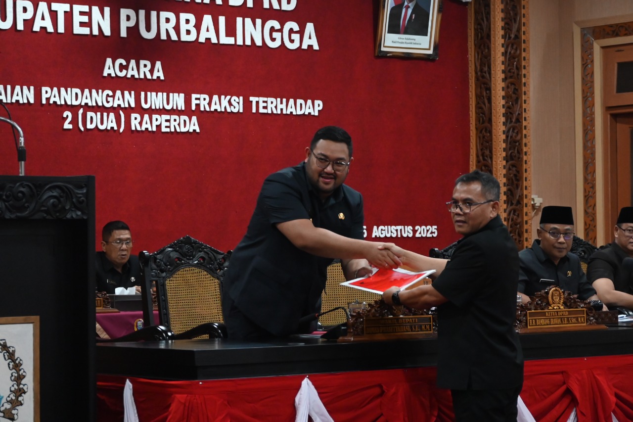 Jatengpress.com, Purbalingga – Seluruh fraksi di DPRD Kabupaten Purbalingga menyampaikan dukungan terhadap dua Rancangan Peraturan Daerah (Raperda) usulan Bupati tentang Pembentukan dan Susunan Perangkat Daerah serta Raperda tentang Penyelenggaraan Inovasi Daerah. Dukungan itu disampaikan dalam Rapat Paripurna DPRD yang digelar Selasa (5/8/2025), dan dihadiri Wakil Bupati Dimas Prasetyahani mewakili Bupati Fahmi Muhammad Hanif.