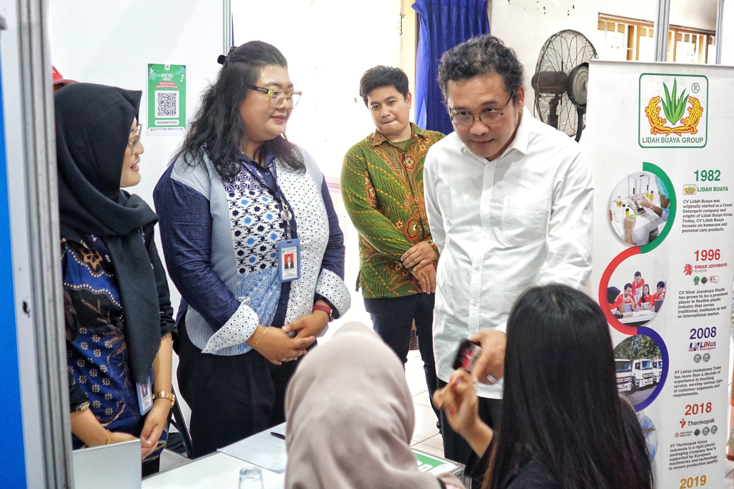 Ket foto : Bupati Grengseng Pamuji tengah berdialog dengan penjaga stand perusahaan peserta Job Conect Fest 2025. (ist)