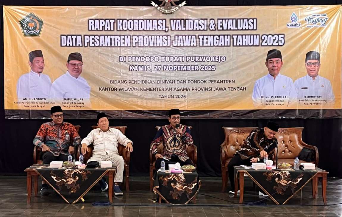 Jatengpress.com,Purworejo-Pondok pesantren memegang peran sentral dalam membentuk karakter, moral, dan peradaban bangsa melalui pendidikan agama yang moderat, toleran, dan inklusif. Penegasan itu disampaikan Sekretaris Komisi IV DPRD Kabupaten Purworejo, H. Much Dahlan, SE, saat menjadi narasumber dalam Rapat Koordinasi, Validasi, dan Evaluasi Data Pesantren Provinsi Jawa Tengah Tahun 2025 di Pendopo Rumah Dinas Bupati Purworejo, Jawa Tengah, Kamis (27/11/2025).