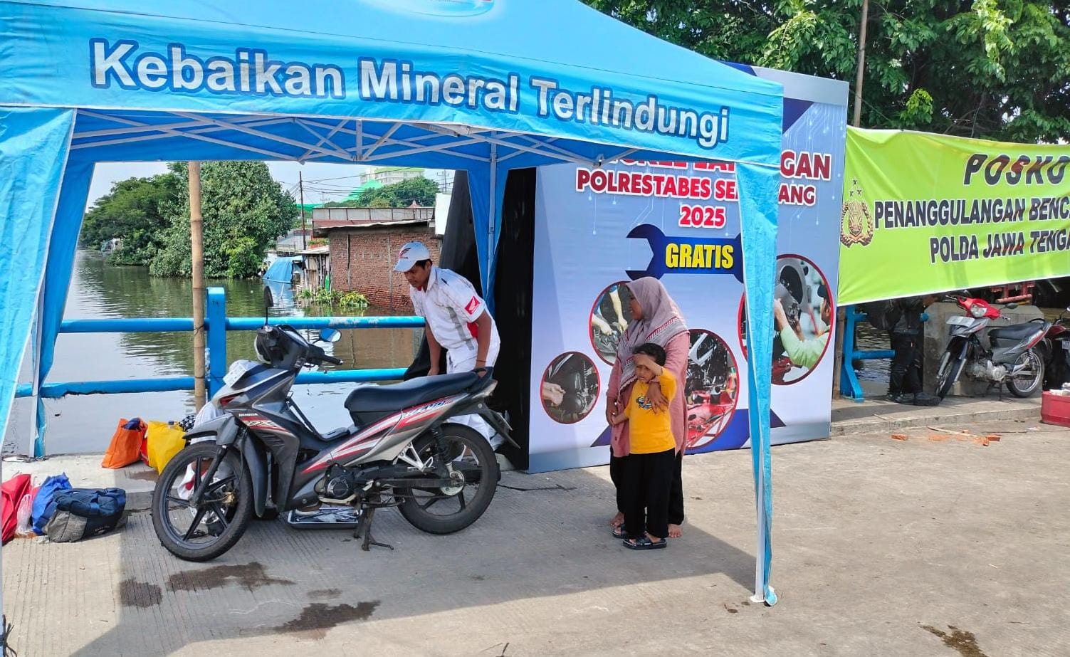BENGKEL LAPANGAN : Bengkel lapangan didirikan oleh Polrestabes Semarang, Jumat (31/10/2025), untuk membantu masyarakat pengguna jalan, yang kendaraannya mogok akibat melintas di genangan banjir. Bengkel lapangan gratis ini didirikan di jalan raya Kaligawe, depan pabrik White Coffee. Foto : ist